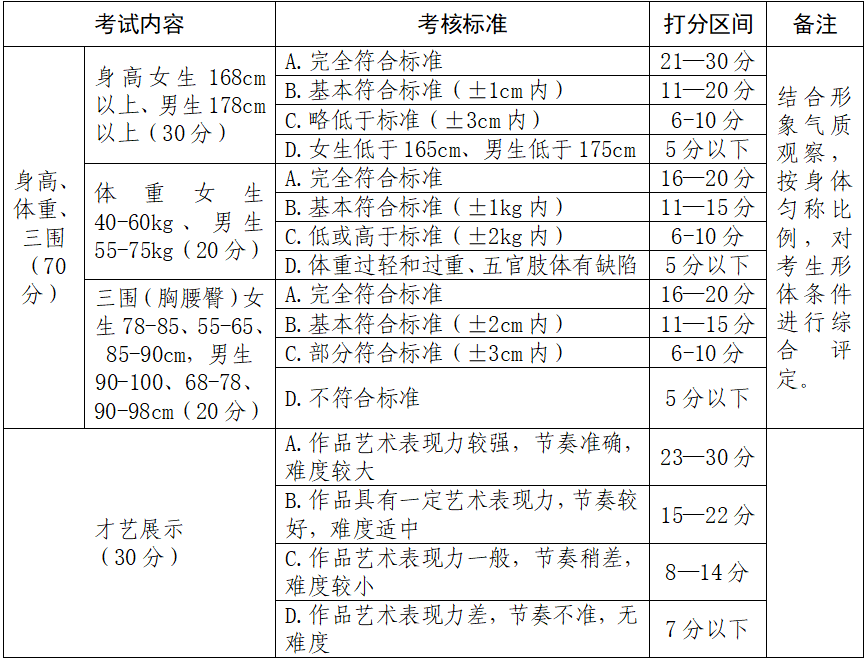 综合艺术(服装表演)专业测试办法与评分标准
